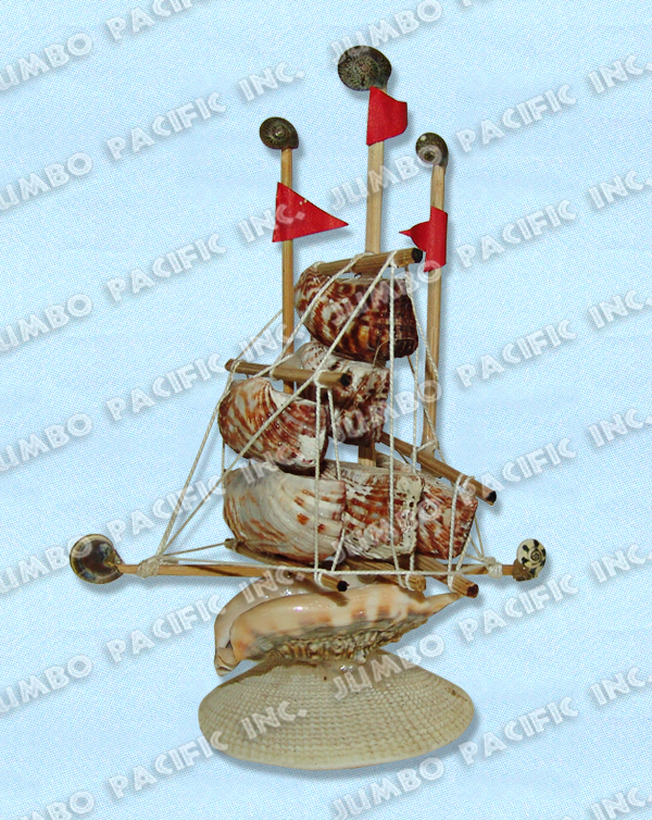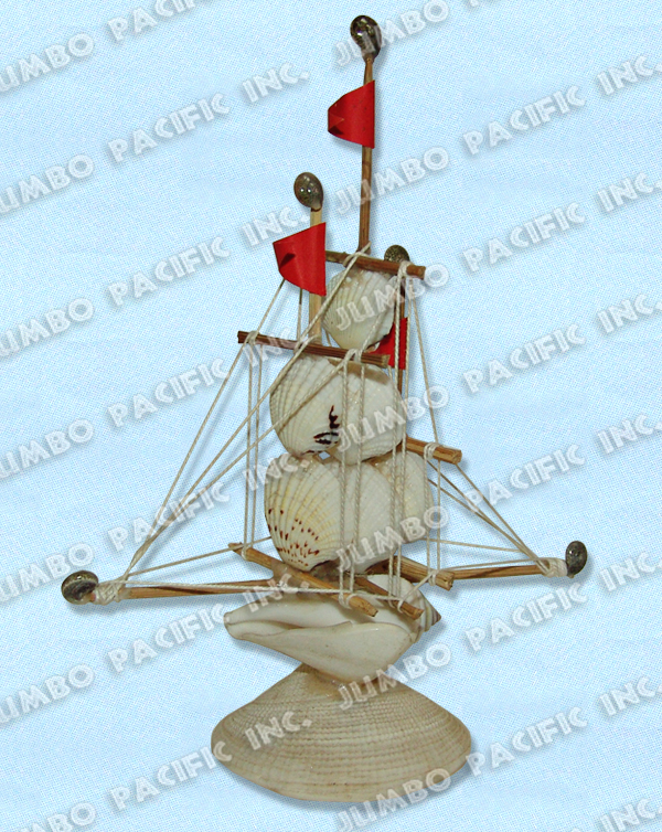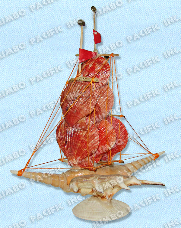 Description: Shell Boats in miniature 10 inches made of saang shell, torrotilla shell and pectin nobilis red shell. |